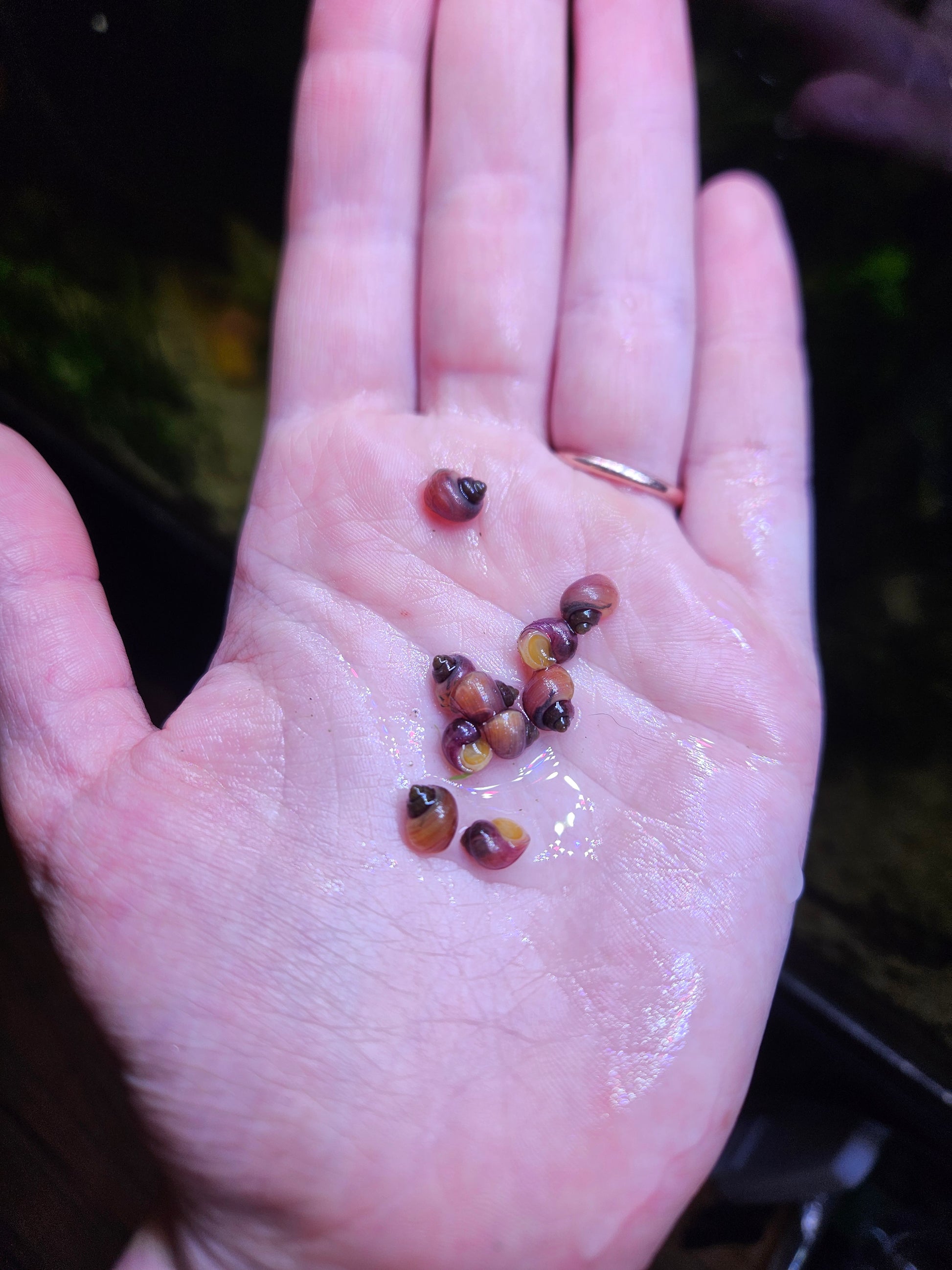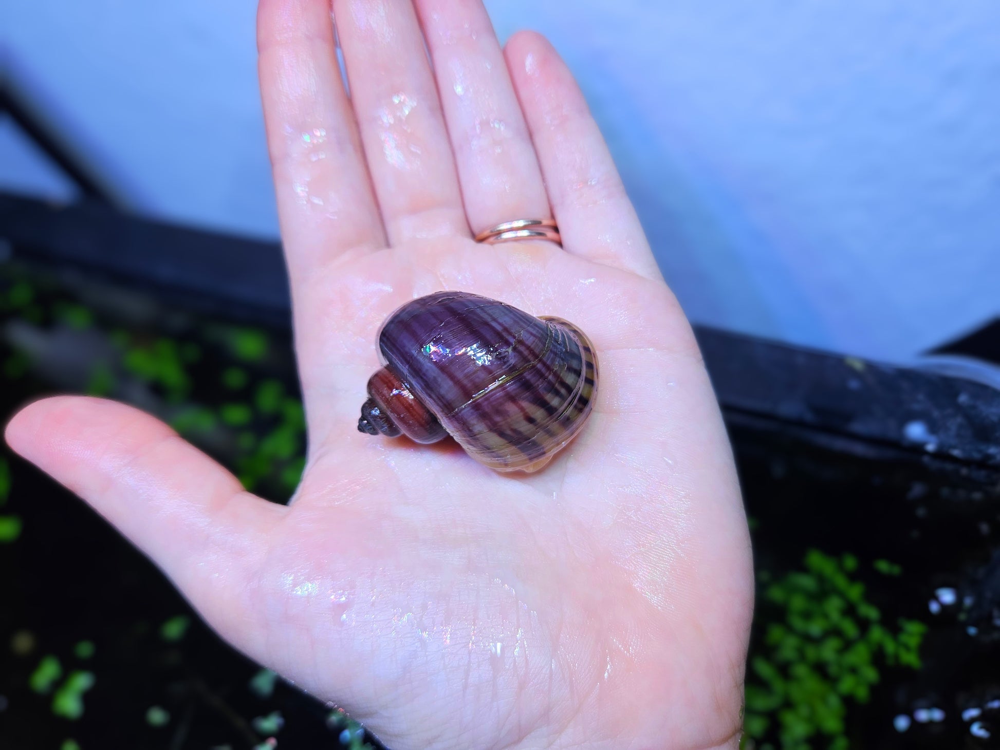 These Magenta mystery snails (Pomacea bridgesii) may be confused with the similar-looking illegal and invasive 'Apple snails', but they are not! Coming from a similar family, Mystery snails do not eat plants, besides the occasional Duckweed plantlet.